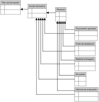 En un caso, más orientado a la gestión de la acción formativa basada en planes anuales de formación, y en el control de la misma (documentación aportada para la matrícula, faltas de asistencia, materiales entregados, encuestas e informes de evaluación) el modelo de entidad-relación fue el siguiente: